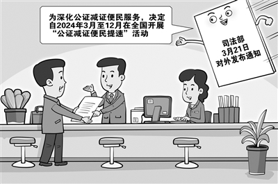 司法部21日对外发布通知,为深化公证减证便民服务,决定自2024年3月至12月在全国开展“公证减证便民提速”活动,以“高效办成一件事”为标准,优化公证流程,创新工作方式,有效提升公证服务质量和办证效率。(3月21日 新华社)□朱慧卿