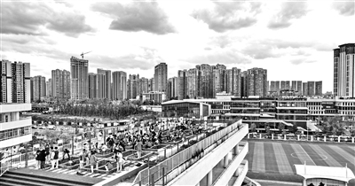 成都市中和中学在教学楼楼顶建有一片“空中农田”,各班级负责管理“责任田”。学生在老师的指导下参与种植玉米、茄子、西红柿、白菜、辣椒等多种农作物,学习农作物种植知识,感受劳动带来的快乐。图为在成都市中和中学楼顶农田,中学生开展春季农作物播种劳动实践(无人机照片)。 新华社发