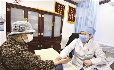 近年来,北京市朝阳区大力推进基层卫生服务中心中医药体系建设,提升家庭医生中医药能力,将优质中医资源进一步下沉到百姓身边,让百姓在家门口就能获得中医药服务。图为朝阳区东风社区卫生服务中心石佛营东里社区卫生服务站的中医为居民诊脉。
