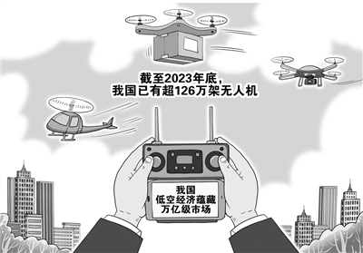 科技飞速发展,航空业的未来已不局限于万米高空。2024年的春天,低空经济成为一个热门词。中国民航局3月29日发布数据显示,截至2023年底,我国已有超126万架无人机,同比增长约32%。2023年,民用无人机累计飞行超2300万小时。民航局已批准建立民用无人驾驶航空试验区17个、试验基地3个,覆盖城市、海岛、支线物流、综合应用拓展等场景。(3月30日 新华社)□朱慧卿