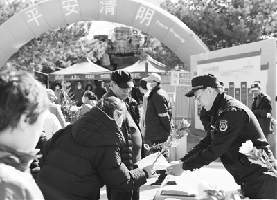 清明节前夕,通州区城管执法局与宋庄镇综合行政执法队在通惠陵园开展“理性追思 文明祭扫”引导行动。城管执法队员和志愿者向前来祭扫的市民发放文明祭扫倡议书、赠送鲜花,呼吁人们使用鲜花表达追思,倡导广大市民文明祭扫。本报记者 彭程 摄影报道