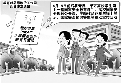今年4月15日是第九个全民国家安全教育日。记者从教育部获悉,教育部思想政治工作司近日印发通知,组织开展2024年全民国家安全教育日活动。根据通知,4月15日前后将开展“千万高校学生同上一堂国家安全教育课”、高校国家安全视频公开课、主题作品征集与线上展示、国家安全知识答题等重点宣传活动。(4月5日 新华社)□朱慧卿