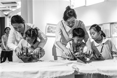 近日,重庆医科大学附属璧山医院联合重庆三合美术馆举办的“百草创艺”中医药艺术作品展开幕。青年艺术家和部分少儿美术生利用中药药渣和废弃中药材,创作了70余幅中药主题美术作品。图为医生志愿者指导小朋友研磨中药材。新华社发