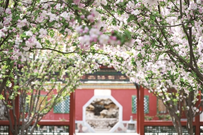 春日里的故宫,各种花卉竞相绽放,姹紫嫣红,美不胜收。图为故宫里的海棠花。