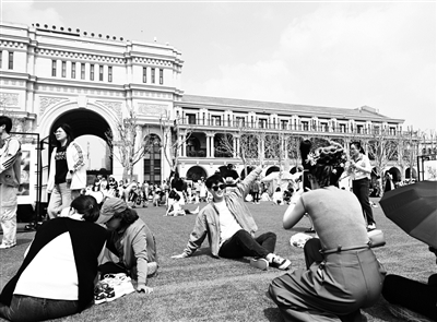 坐上马车在老街区中穿行游览,到民园广场跟着音乐会的旋律嗨唱,去大理道上的中式庭院樘院品一杯下午茶……如今,具有深厚历史文化底蕴的五大道还打造“海棠花节”品牌,中西合璧、古今交融的历史街区正源源不断地吸引着八方来客。图为游客在五大道民园广场休闲游玩。