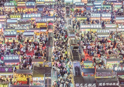 今年以来,河北省石家庄市正定县打造了一批特色鲜明、业态多元、整洁卫生的城市夜经济地标,吸引来自全国各地的游客,释放夜间消费潜力,培育出新的经济增长点。图为人们在正定县小商品夜市品尝美食(无人机照片)。