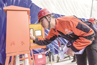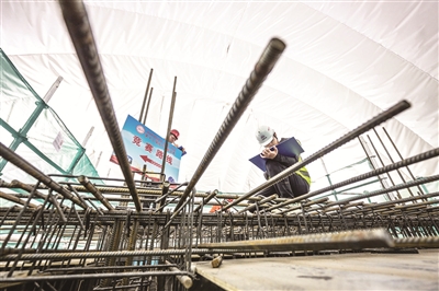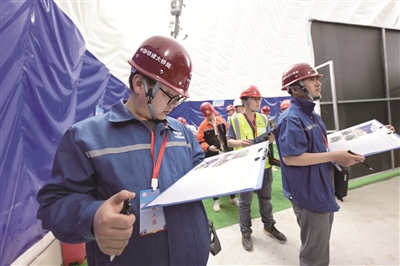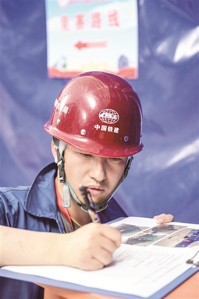 竞赛考场设置在一个1:1比例的“施工现场”,实景模拟轨道交通工程明挖车站施工作业环境。手电筒、卷尺、笔……拿到工具包后,参赛选手刘振冀迅速进入竞赛状态。有着7年工程技术质量工作经验的他,双眼紧盯每个环节、找寻着隐藏的质量隐患。