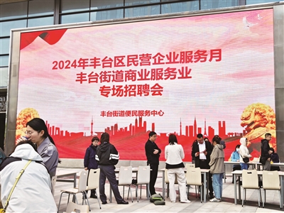 近日,丰台街道便民服务中心在金唐新光界购物中心广场举办2024年“民营企业服务月”线下招聘会。20余家企业带来300余个岗位,涵盖信息技术、服务、教育、财务、餐饮等多个行业。此次活动共有163名重点群体办理求职登记,就业服务专员为重点群体提供105人次“点对点”服务,87人达成初步就业意向。本报记者 曹立栋 摄影报道