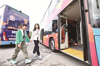 记者在现场看到,5辆装饰一新的“文旅公交专线”格外抢眼,车身以蓝、橙、绿、紫、青为底色,绘有友谊桥、贝壳剧场、奥林匹克中心区等众多朝阳城市地标。车厢内部装饰更是别出心裁,以“一车一主题”打造车厢文化。车辆一楼侧板处绘制专线整体路线景点图,在车顶等处绘制亮马河国际风情水岸、朝阳公园、奥林匹克森林公园等途经的重点文商旅地标介绍与图景,车内车外相辅相成。同时,车厢内设置了文创展示橱窗,摆放着朝阳特色文创品牌“潮有范儿”系列文创品,还有别具特色的公交车模型,让乘客感受北京公交百年文化魅力。