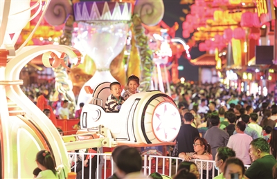 天山明月城位于新疆乌鲁木齐市水磨沟区,是集餐饮、歌舞演艺、休闲娱乐为一体的综合性文化旅游地标。“五一”假期,天山明月城迎来客流高峰,人们在这里体验传统与现代并存的魅力。图为小朋友在新疆乌鲁木齐市水磨沟区天山明月城体验游乐设施(5月4日摄)。