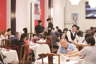随着旅游“红五月”的开启,消费活力点燃了餐饮市场。记者昨天从聚德华天公司和北京华天集团了解到,旗下各老字号品牌尤其是毗邻旅游景区的门店接连翻台,连日来每天就餐时段从午餐延至晚餐。同和居、同春园、鼓楼马凯餐厅等多个老字号品牌采取“错峰上班制”,让职工以饱满的工作热情上岗。本报记者 孙妍 摄影报道