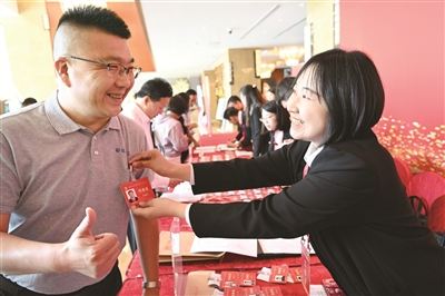 北京市工会第十五次代表大会将于今天开幕。昨天下午,出席大会的代表们以高度的责任感和饱满的热情来到会议驻地报到。图为北京北安时代创新设备安装工程有限公司主任工程师陶建伟代表报到时,工作人员为其佩戴上代表证。