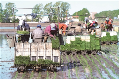 近日,我国重要的粮食主产区黑龙江省三江平原地区水田插秧作业全面启动。图为人们驾驶插秧机进行水稻插秧作业。 新华社发