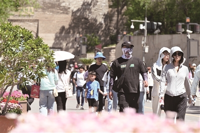 5月京城,半城绿树,半城花。5月13日12时20分,南郊观象台气温升至30.1℃,这是今年北京首次冲上30℃,初夏感瞬间拉满。图为在晴晒天气下的八达岭长城景区,游人“全副武装”防晒出行。