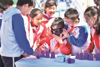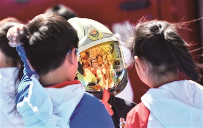 “我来我来,让我试试!”在消防救援车前,消防员手拿热敏成像仪,周围出现不同温度,成像仪上便呈现出不同的数字和色彩图形,这让同学们兴奋起来,争先恐后伸出小手。