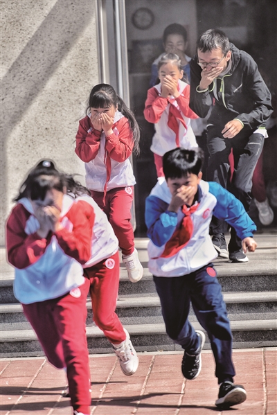 一枚发烟弹打出,警铃响起,老师和学生手捂口鼻弯腰跑出教学楼……1分21秒,几百名小学生从楼内向操场疏散完毕。