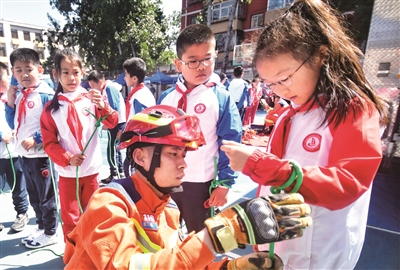 “手拿出来,假设是一个物体,在物体上面打两圈,短绳在长绳那边再绕两圈……”消防员耐心地向同学们讲解着逃生绳结的方法,“现在学会了,以后遇到紧急情况就可以使用。”