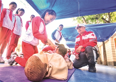 在防触电体验区,老师将体验的机器打开,一名男生小心翼翼地将手放在指定的接触点。在心肺复苏体验区,每两名小学生一组,学习心肺复苏技能。在止血包扎体验区,学生们在学习手脚骨折的包扎方法。
