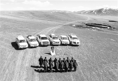 从5月7日起,西藏那曲市尼玛县召集10余名骨干野生动物管护队员,计划用约两周时间对尼玛县境内3万多平方公里的羌塘国家级自然保护区核心区域进行集中巡护。羌塘国家级自然保护区位于西藏自治区北部,核心区绝大部分没有人类活动,主要保护对象为独特的高寒生态系统及多种大型有蹄类动物。保护区的尼玛县共有11个野生动物管护站,135名管护队员,他们常年顶风冒雪,穿越无人区进行巡护,默默守护着这里。图为野生动物专业管护队员在无人区深处的罗布玉杰烈士纪念碑前默哀致敬。罗布玉杰2002年在与盗猎分子的枪战中牺牲。