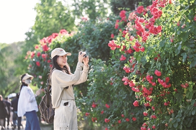 近日,北京大街小巷的蔷薇、月季竞相开放,明媚娇艳,成为京城一道亮丽的风景线,吸引不少游人驻足。图为昨日下午,北京蓝色港湾南出口外,市民在月季花墙下拍照打卡。