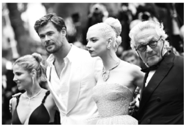近日,在法国南部小城戛纳举行的第77届戛纳国际电影节上,影片导演乔治·米勒(右一)、主演安雅·泰勒-乔伊(右二)和克里斯·海姆斯沃斯(左二)出席非竞赛单元影片《疯狂的麦克斯:狂暴女神》首映礼。