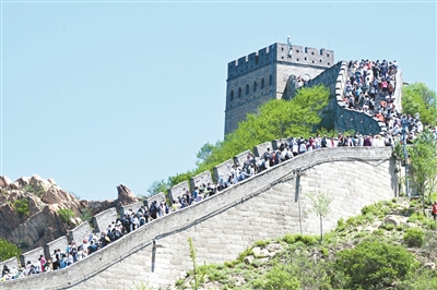 5月26日,晴空万里下的八达岭长城蜿蜒起伏,宛如一条巨龙横卧在群山之间。游客们沿着城墙拾级而上,或是远眺群山连绵,或是拿出手机、相机记录下这初夏的美好景色。