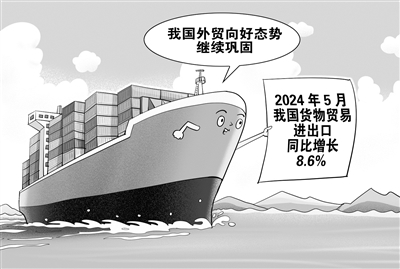 我国外贸向好态势继续巩固。海关总署7日发布数据显示,今年前5个月,我国货物贸易进出口总值17.5万亿元,同比增长6.3%。其中,5月当月进出口3.71万亿元,同比增长8.6%,增速比4月提高0.6个百分点。(6月7日 新华社)□朱慧卿