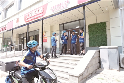 朝阳区八里庄街道总工会服务站最近增设了一个大冰柜,里面放满了冰棍、矿泉水、凉茶饮品,这里专门为户外劳动者设置“清凉角”,驿站工作人员每天都会热情招呼辖区内外卖、快递、环卫、保安等行业的户外劳动者进来免费领取冷饮、纳凉防暑。中午送餐高峰一过,外面骄阳似火,几位饿了么外卖小哥更是“组团”来到这里乘凉,吃上一根冰棍,享受空调冷气,消解一上午的暑气和疲惫。