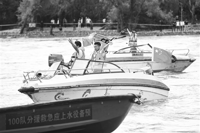 汛期到来,为提升相关部门水上搜救应急处置能力,6月20日,甘肃省交通运输厅与兰州市人民政府联合在黄河兰州段盐场堡码头水域举办“交通使命 畅安水路”水上交通应急搜救综合演练。演练设置船舶艇碰撞乘客意外落水、船舶失火及被困人员转移等事故情景,来自兰州水运集团、兰州市消防救援支队、兰州市公安局水上派出所和部分民间救助团体的人员模拟事故情景完成应急处置流程。图为救援人员进行应急搜救综合演练。新华社发