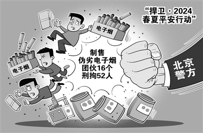 记者从北京市公安局环境食品药品和旅游安全保卫总队获悉,在近期开展的“捍卫·2024春夏平安行动”中,北京警方联合烟草专卖部门深入打击制售伪劣电子烟违法犯罪活动,截至目前破获相关案件15起,打掉犯罪团伙16个,捣毁窝点32处,刑事拘留52人。同时,起获生产设备80余台、烟弹24万余个、烟油5.4吨。(6月20日新华社)□朱慧卿