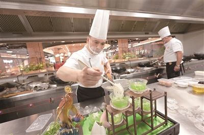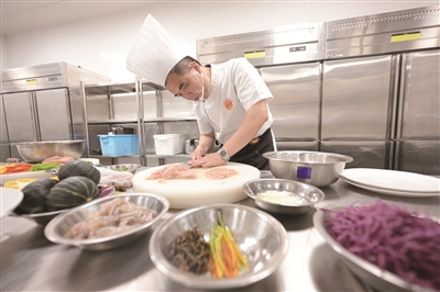 参赛选手王天师制作完指定作品五彩鸡丝后,来到展示区认真观摩其他选手的作品。“来参赛的选手基本功都非常扎实。”王天师向记者介绍,五彩鸡丝看似简单,但非常考验选手刀工、上浆、火候、调味的水平,对厨师的综合业务能力要求比较高。王天师准备的自选菜是养生鳕鱼煲,这是一道他自创的粤菜,主食材是深海鳕鱼和有机香芹,不但外观令人赏心悦目,味道也很清新鲜美。“这道菜的最大特点是营养价值高,低脂肪、高蛋白质,含有丰富的维生素,非常适合减肥减脂的人群。”王天师说。