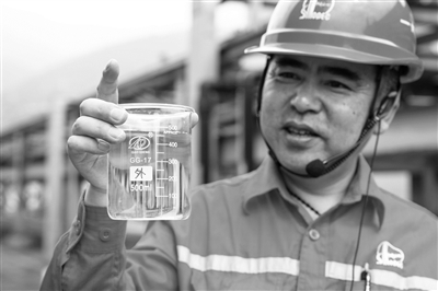日前,我国首个投入商业开发的页岩气田——重庆涪陵页岩气田累计产量已突破650亿立方米。涪陵页岩气田累计探明储量近9000亿立方米,目前已累计部署立体开发调整井超500口。图为页岩气田白涛产出水处理站工作人员展示处理合格的产出水。 新华社发