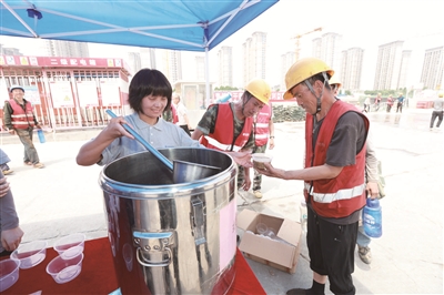 连日来,京城持续高温,此次首都职工志愿“大篷车”为职工们带来了“夏送清凉”慰问品,包括矿泉水、猪肉、牛奶等。午休时,“大篷车”已经准备就绪,刚走出基坑的职工们,手持舀勺盛满一杯杯绿豆汤一饮而尽,说不尽的“痛快”。