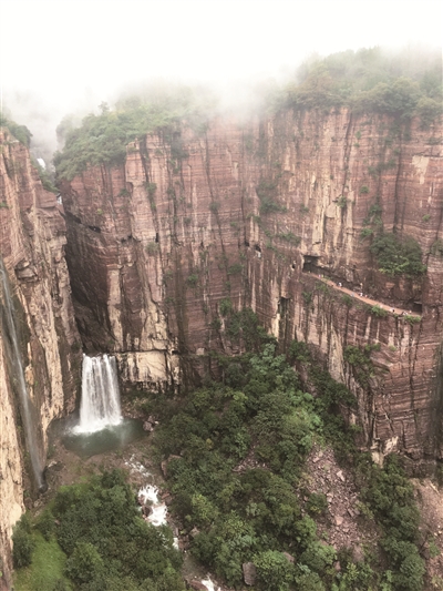 每每走岀一个洞囗,就转入一条悬壁长廊之中,行走在上面,仿佛就在云端漫步,一步之外便是万丈深渊。抬眼处,峡谷气势雄浑磅礴,山峰犹如刀劈斧切,低头看,感觉脚下的每一寸路面,似乎都充满了村民们的血和汗。回望这条巍峨壮观的绝壁长廊,眼前不禁反复映现着这么一个情景:在险峻的悬崖上,十三个铁骨铮铮的汉子,腰系粗绳,凌空作业,以钢钎凿赤岩,用铁锤破石壁,溅飞而起的碎石,在空中划着一条条优美的弧线……