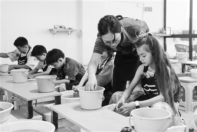 7月3日,在浙江省慈溪市匡堰镇上林湖青瓷文化传承园的暑期青瓷文化课堂上,小学生在工作人员的带领下体验青瓷拉坯。慈溪是中国瓷器的发源地之一,也是越窑青瓷的中心产地,全市有越窑遗址近200处,青瓷文化历史悠久。 新华社发