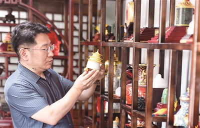 自2017年来到北京工美集团有限责任公司白孔雀艺术世界并成立创新工作室后,冯延明就一直处于高产状态,累计创新研发产品近80件,获得国家级金奖11个。“每年我们都会推出新产品,而且不仅仅局限在玉雕领域,之前推出的十二生肖主题紫砂茶壶,投入市场后收到很好的反响。”冯延明介绍说,今年,他带领工作室创新性地设计制作了“百宝珮”系列和田玉宝瓶,可以收纳速效救心丸、硝酸甘油、香水等,是一件兼具实用性的装饰品。“百宝珮”的灵感来源于顶戴花翎的翎管,是一种宫廷技艺,为了兼具美观和实用性,它的成品底部厚度仅三毫米,在数字化制作的基础上,又包含了手工技艺,同时为了契合瓶口的金属件,设计时曾以0.1毫米为单位反复比对、调整,才最终呈现。“不光是‘百宝珮’,每一件作品,我们都发扬工匠精神,力求达到完美。”