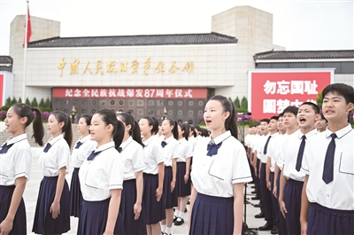 7月7日,纪念全民族抗战爆发87周年仪式在北京中国人民抗日战争纪念馆举行。图为首都学生代表参加纪念全民族抗战爆发87周年仪式。