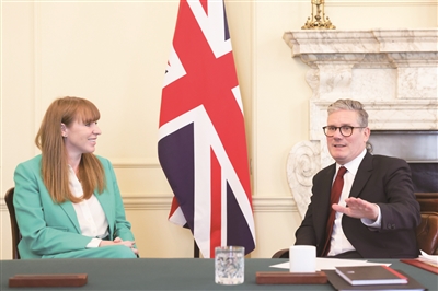 英国4日举行议会下院选举,选举结果5日出炉。斯塔默领导的工党赢得议会下院超过半数席位,成为执政党。当天在白金汉宫,斯塔默被国王查尔斯三世授权组建新内阁,正式就任首相。图为7月5日,在英国伦敦唐宁街10号首相府,首相基尔·斯塔默(右)与安杰拉·雷纳交谈。