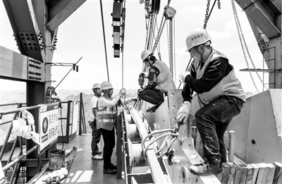 近日,贵州花江峡谷大桥建设加快推进,正有序进行大桥主缆索股架设施工。花江峡谷大桥是贵州六安高速公路的控制性工程,全长2890米,主桥桥面与谷底的北盘江水面垂直高度达625米。大桥建成后,将超越北盘江大桥,成为世界第一高桥。图为工人在花江峡谷大桥6号主塔进行主缆索股架设施工。 新华社发