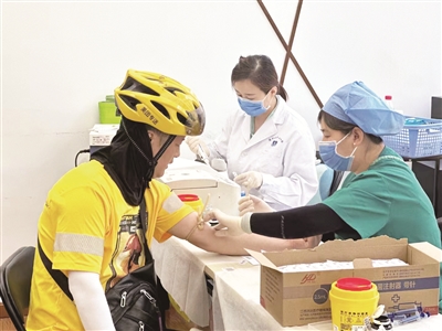 近日,朝阳区望京街道组织开展无偿献血活动,望京街道总工会动员辖区新就业形态劳动者积极参与。三天的时间里,来自顺丰、圆通、韵达、京东、达达、饿了么、美团等企业的共计80余名新就业形态劳动者来到现场参与献血活动,用自己的爱心为生命“续航”。