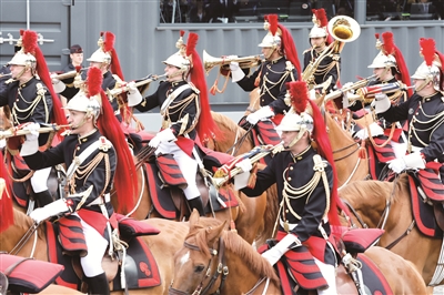 法国一年一度的国庆阅兵式7月14日在巴黎举行。阅兵队伍当天上午从凯旋门出发,沿福煦大街走向主席台所在的拉特尔·德·塔西尼元帅广场,飞机掠过巴黎上空。图为在法国巴黎凯旋门附近拍摄的国庆节阅兵式现场。