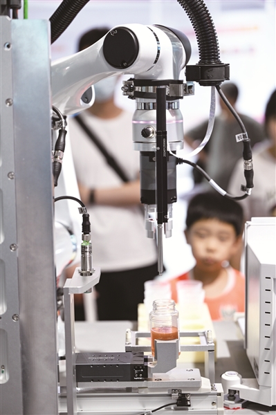 走进京津冀协同发展成果展区,氢能储能、生物医药、智能网联新能源汽车和新一代信息技术等高精尖领域新成果汇聚一堂。来自戴纳科技的液体自动精准称重机器人,吸引着往来观众的目光。灵巧的机械臂将托盘中的水杯平稳端起,移动到电子秤上,显示屏上的液体重量一目了然,可精确到小数点后四位。