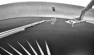 承建项目团队建立金属屋面全生命周期数字平台,全过程开展BIM深化设计,将幕墙、金属屋面异形曲面板块的分割深化精确到毫米,把东登录厅15000余块覆盖近1.2万平方米的不规则铝板条带用四点定位控制,大幅度减少人工误差。
