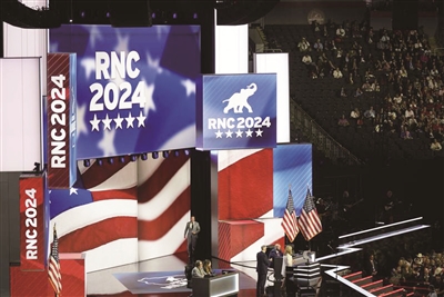 特朗普13日在宾夕法尼亚州巴特勒市举行的竞选集会上遭“未遂刺杀”,右耳受伤。但他按照原计划于14日抵达威斯康辛州的密尔沃基,参加15日至18日举行的共和党全国代表大会。特朗普预计于18日正式接受提名。图为7月15日在美国威斯康辛州密尔沃基拍摄的共和党全国代表大会现场。