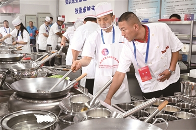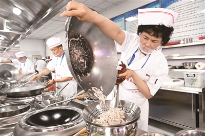 快速的切菜声、滋滋的炒菜声……选手们令人眼花缭乱的动作伴随着锅、碗、瓢、盆、盏等炊具演奏的乐曲,不一会儿功夫,一道道鱼香肉丝、京酱肉丝、芹菜肉丝等丝类比赛菜品就做好了。