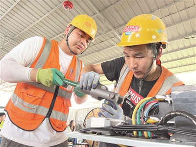 随着比赛号角的吹响,钢管套丝选手首先出场,夹紧钢管、启动套丝、涂漆防腐、绑扎麻绳……一系列动作行云流水。“在日常机电施工中,9成以上管线漏水都与施工不规范有关,不是套丝长度过短,就是麻绳未缠紧,因此本次将套丝作为基础比赛项目,就是希望能以赛代练。”该项目负责人介绍。本次配电箱比赛是由两名选手合作进行,参赛选手需要完成从管线排布到安装空气开关、连接电缆等工序。面对直径10厘米的电缆,从剥线、接线、压头、套热缩管,比赛选手都非常熟练,每一步操作得有条不紊。