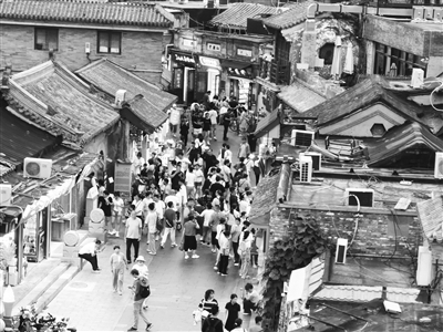 时下,正值暑期旅游高峰。记者昨天晚上在什刹海烟袋斜街看到,夜幕初上,暑热褪去,该街道两侧的特色小店灯火通明,走在这条百年历史的街道上,游客们品尝美食,体验特色非遗,一派红火景象。