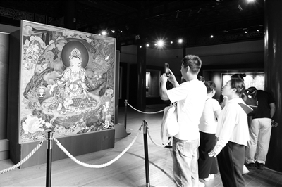 景山公园观德殿内“国粹新辉·紫禁之巅——掐丝珐琅绘画作品展”正在展出。本次展览共展出20余幅掐丝珐琅绘画作品,重现了我国明代壁画巅峰之作——法海寺《帝释梵天礼佛护法图》的色彩系统,体现了传统技艺与现代审美观念的融合。