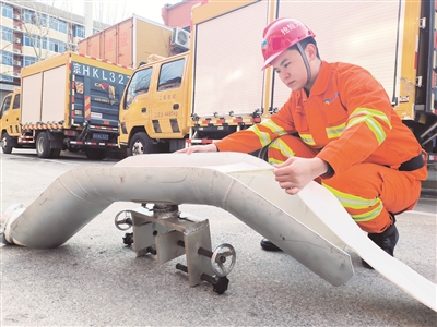 “这个装置是我们团队共同研发设计的‘360°旋转无折叠导水支托’,并获得了专利。在下凹桥区积水抢险处置过程中,排水软管需要跨过栏杆,将积水抽排到桥上的排水井里。但排水软管跨过栏杆之后会产生很大的弯折、挤压,阻碍通水的流量。”杨宗晓说,让水龙带通过导水支托翻过栏杆,有一个弧线过渡,不会造成严重的弯折;360°的设计便于各个方向的排水管线都可以进行使用,从而提升了30%的抽排积水效率。