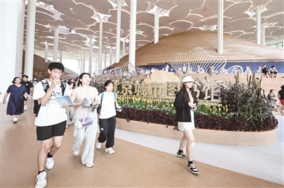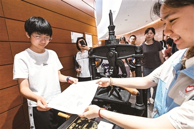 这个暑期,不少人像王女士一样选择走进北京城市图书馆,在这个书香满溢的文化空间中享受一场“文旅盛宴”。少年儿童馆中,工作人员带着小读者们兴奋地体验着智慧展陈;上墨、覆纸、盖板……古籍文献馆里,读者们正在老师的指导下进行雕版印刷体验;艺术文献馆中,人们通过《声游北京》展感受听觉魅力;非遗文献馆/地方文献馆中,大家穿上戏曲行装体验着“戏曲人生”。“藏”在北京城市图书馆这座“书山”之中的众多“馆中馆”,成为了人们争相打卡的场所。
